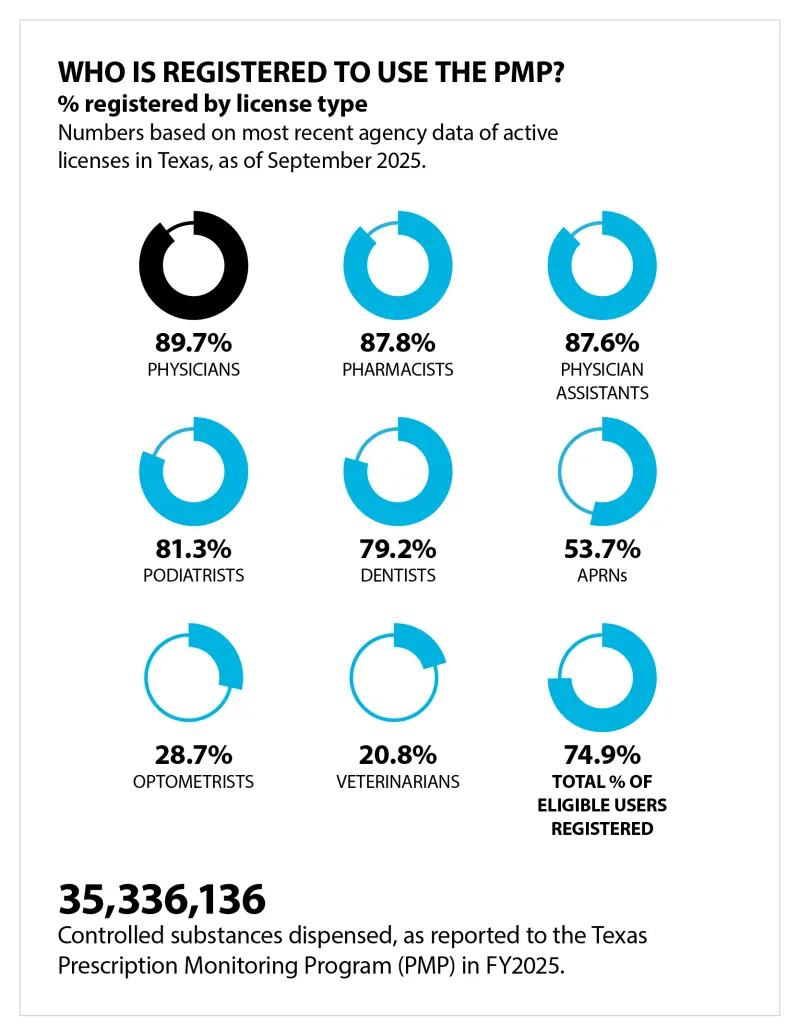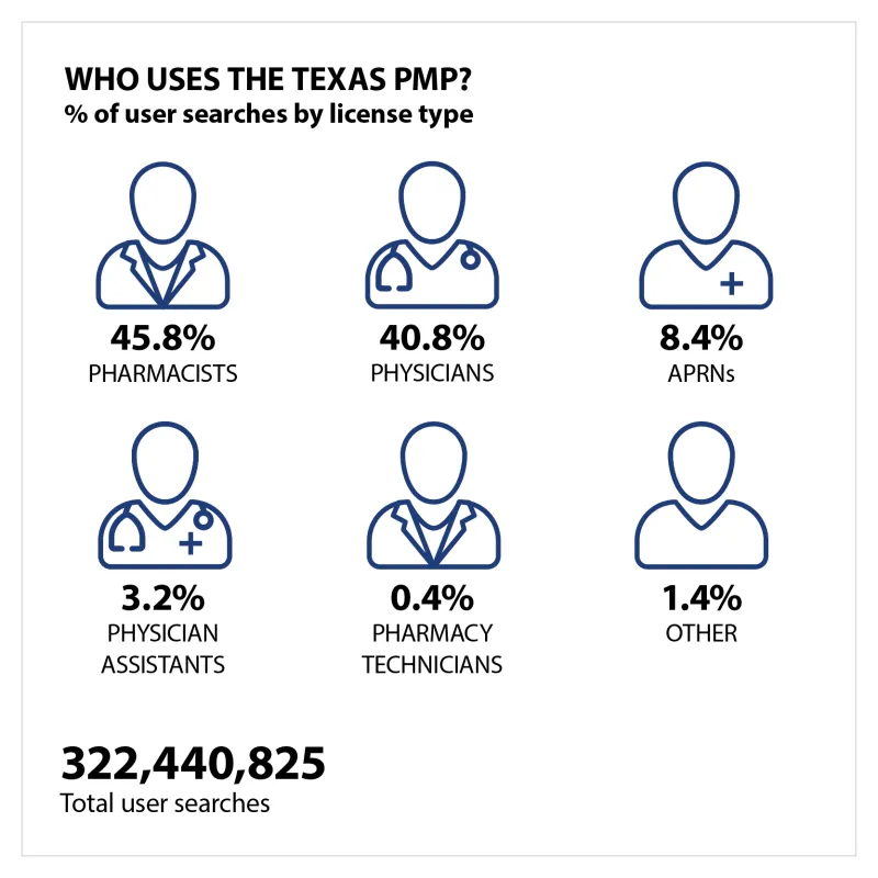 Physicians across the state integrated the Texas PMP into their daily workflows, helping improve communication and patient-centered care. In the five years since, the number of physicians registered to use the Texas PMP has increased from 53.9% to 89.7%.